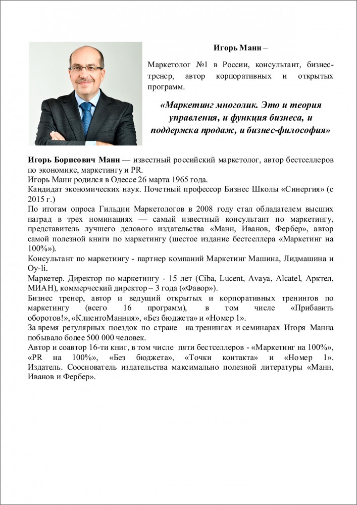 Игорь Манн – называет себя маркетером. Потому что для него маркетолог - это теоретик маркетинга, а он практик. По итогам опроса Гильдии Маркетологов в 2008 году стал обладателем высших наград в трех номинациях — самый известный консультант по маркетингу, представитель лучшего делового издательства «Манн, Иванов, Фербер», автор самой полезной книги по маркетингу (шестое издание бестселлера «Маркетинг на 100%»)