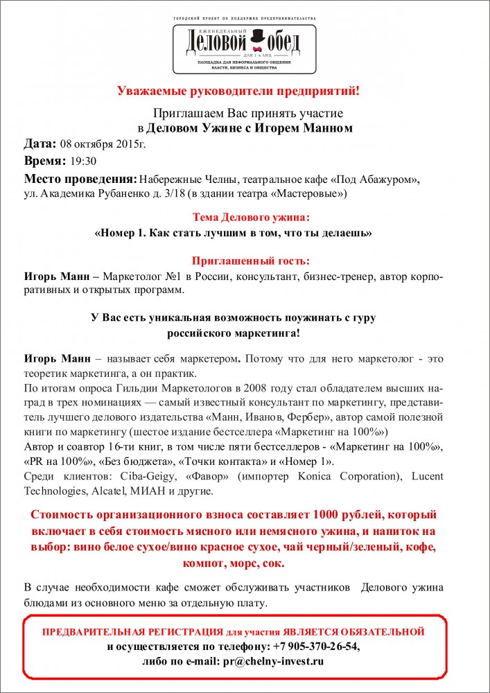 ПРЕДВАРИТЕЛЬНАЯ РЕГИСТРАЦИЯ для участия ЯВЛЯЕТСЯ ОБЯЗАТЕЛЬНОЙ и осуществляется по телефону: +7 905-370-26-54, либо по e-mail: pr@chelny-invest.ru