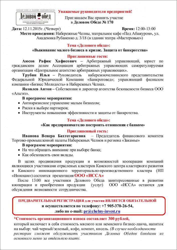 ПРЕДВАРИТЕЛЬНАЯ РЕГИСТРАЦИЯ для участия ЯВЛЯЕТСЯ ОБЯЗАТЕЛЬНОЙ и осуществляется по телефону: +7 905-370-26-54, либо по e-mail: pr@chelny-invest.ru