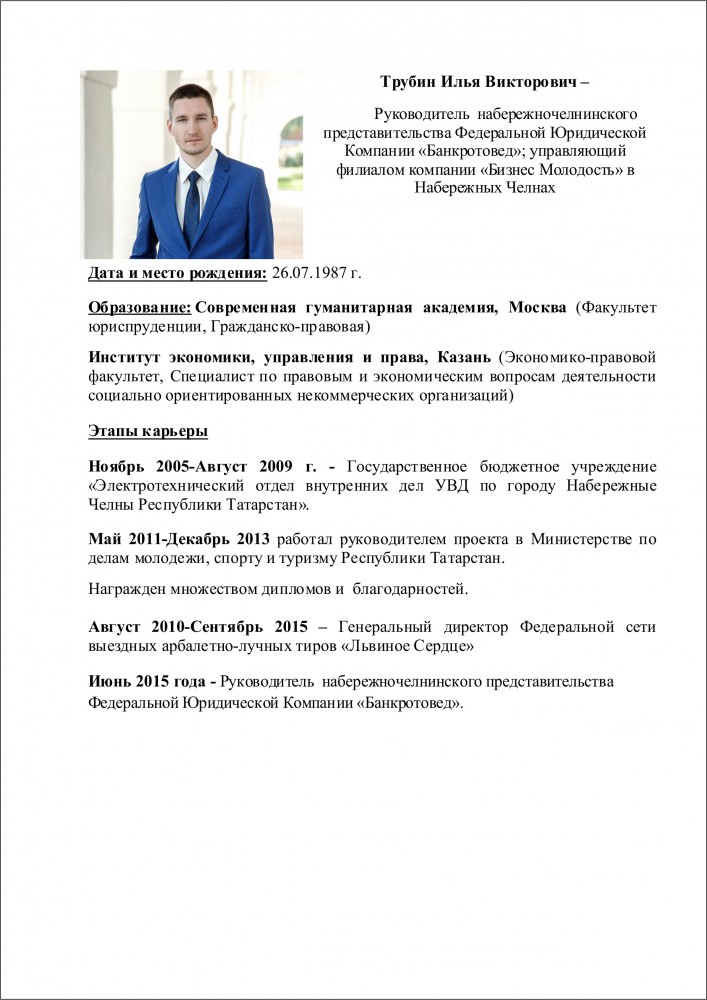 Трубин Илья – Руководитель набережночелнинского представительства Федеральной Юридической Компании «Банкротовед»; управляющий филиалом компании «Бизнес Молодость» в Набережных Челнах.