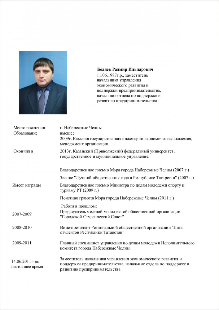 Беляев Радмир Ильдарович – Заместитель начальника управления, начальник отдела по поддержке и развитию предпринимательства Исполнительного комитета м.о. город Набережные Челны