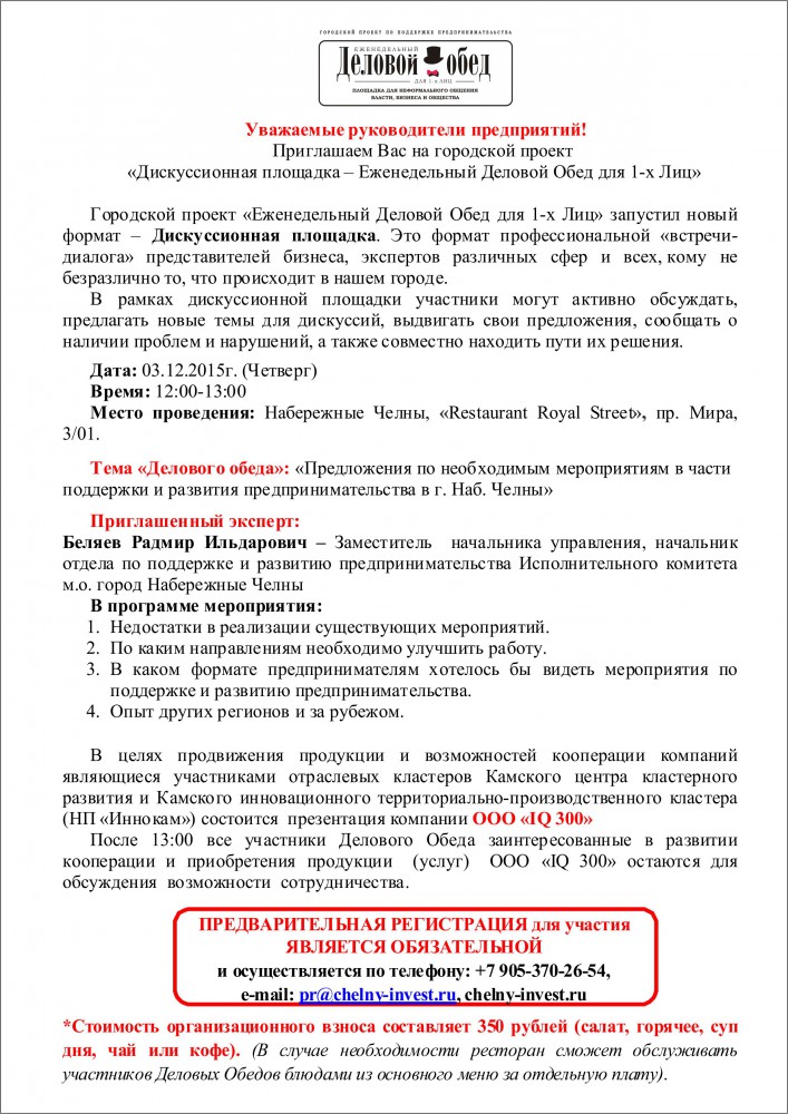 После 13:00 все участники Делового Обеда заинтересованные в развитии кооперации и приобретения продукции (услуг) ООО «IQ 300» остаются для обсуждения возможности сотрудничества.