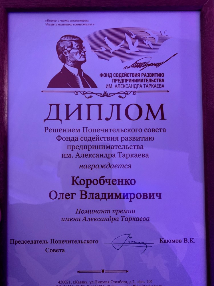 Решением Попечительского совета Фонда содействия развитию предпринимательства им. Александра Таркаева Олег Коробченко был награжден дипломом Номинанта премии имени Александра Таркаева.