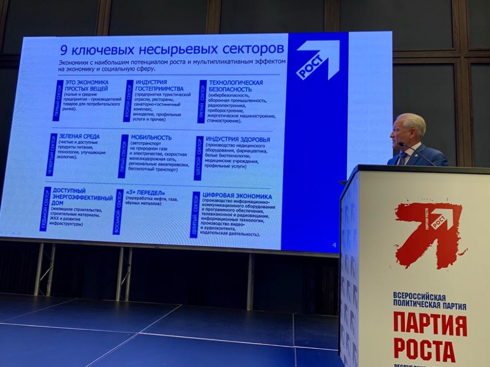 Сергей Майоров рассказал об опыте партийного строительства в Татарстане, открытии 4 территориальных и трех местных отделений, а также о партийных инициативах и проектах. В частности, о программе импортозамещения и пилотных проектах в рамках развития несырьевой экономики. Он напомнил, что «дорожную карту» развития несырьевой экономики в 2018 году одобрил президент России. Возглавил работу над документом бизнес-омбудсмен при президенте России, лидер «ПАРТИИ РОСТА» Борис Титов. В рабочую группу вошел и руководитель регионального отделения в Республике Татарстан ВПП «Партия Роста» Олег Коробченко. В числе 9 несырьевых секторов: экономика простых вещей, индустрия гостеприимства, технологическая безопасность, зеленая среда, мобильность, индустрия здоровья, доступный энергоэффективный дом, переработка нефти, газа, чёрных металлов и цифровая экономика.