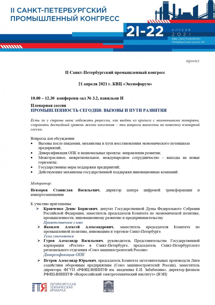 21 апреля в пленарной сессии конгресса «Промышленность сегодня: вызовы и пути развития» запланировано его выступление на тему «Межотраслевое, межрегиональное, международное сотрудничество – выходы на новые горизонты» (10.00–12.30, конференц-зал № 3.2).