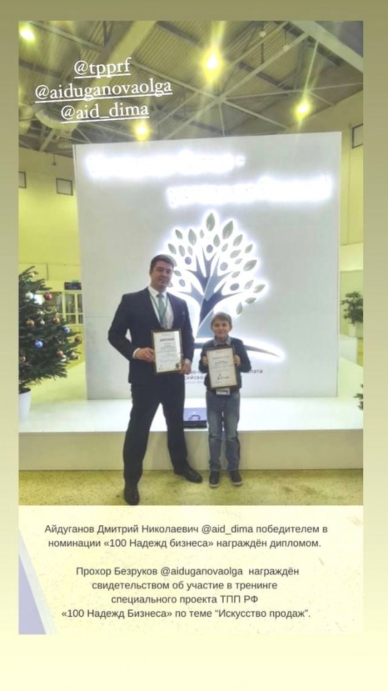 – А юный Прохор Безруков @aiduganovaolga награждён свидетельством об участие в тренинге специального проекта ТПП РФ «100 надежд бизнеса» по теме “Искусство продаж”.