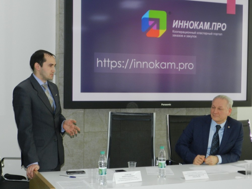Далее выступил Советник Председателя Правления Машиностроительного кластера Республики Татарстан Роман Микешин с презентацией о возможностях работы на созданном Кооперационном кластерном портале заказов и закупок innokam.pro. Данный Портал позволяет реализовать такие цели Машиностроительного кластера как доступ к размещаемым заказам, подбор поставщиков, кооперация в изготовлении изделий и организация совместных закупок. Машиностроительным кластером охвачено переговорным процессом более 400 Государственных корпораций и крупных заказчиков. Благодаря этому в Кластер ежедневно поступают заказы на изготовление машиностроительной продукции. Именно благодаря регистрации на Кооперационном кластерном портале заказов и закупок любое производственное предприятие сможет получить доступ к этим заказам. На момент проведения совещания на Портале было зарегистрировано 53 участника и подано 26 заявок на изготовление той или иной продукции. В планах Машиностроительного кластера набрать тысячи пользователей в срок до конца 2017 года.